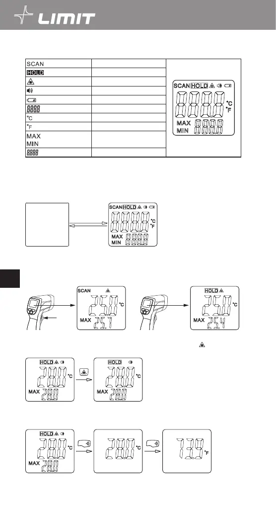 2.1 Orientare il termometro verso il target e premere il grilletto. L’icona SCAN indicherà che è in corso la