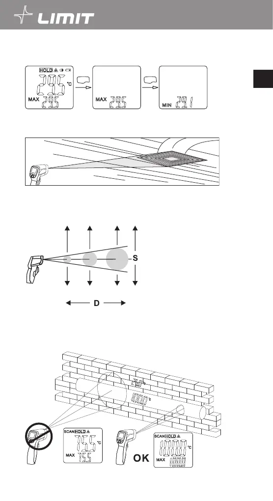 Aim the thermometer at target area and start to measure, then move up and down slowly to sweep the whole