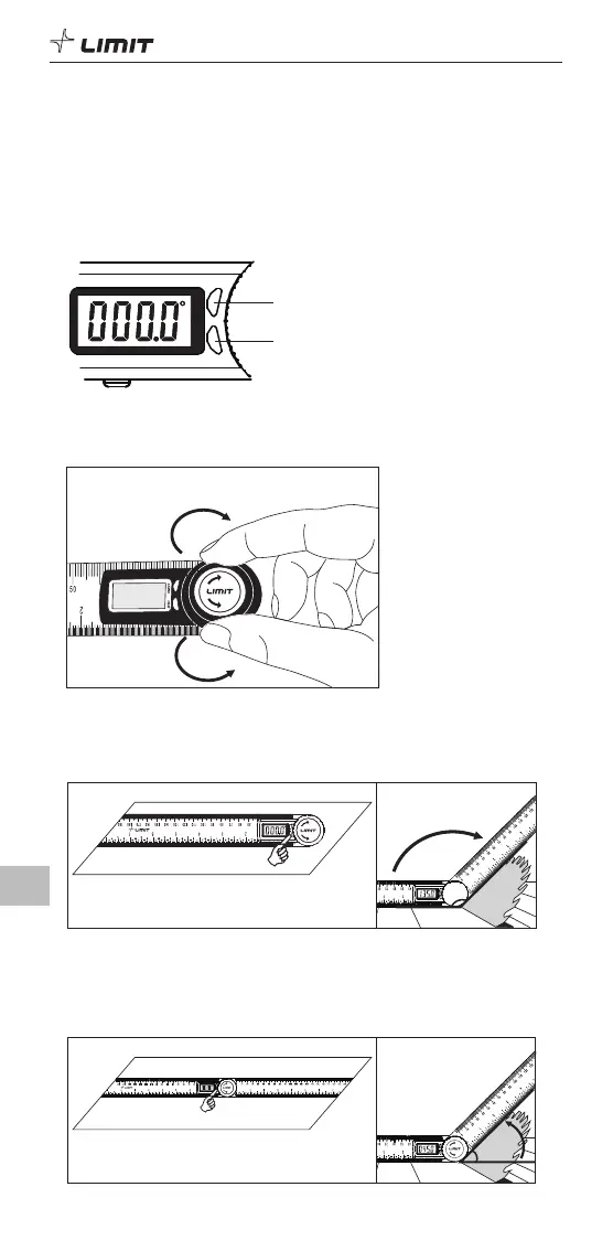 krótkie naciśnięcie przycisku ZERO. Aby zmierzyć kąt obrócić linijkę.