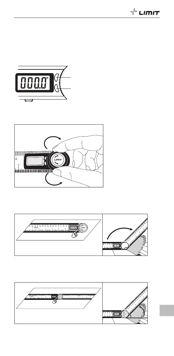 nullējuma pogu, lai iestatītu nulli. Grieziet lineālu, lai mērītu mērķi.