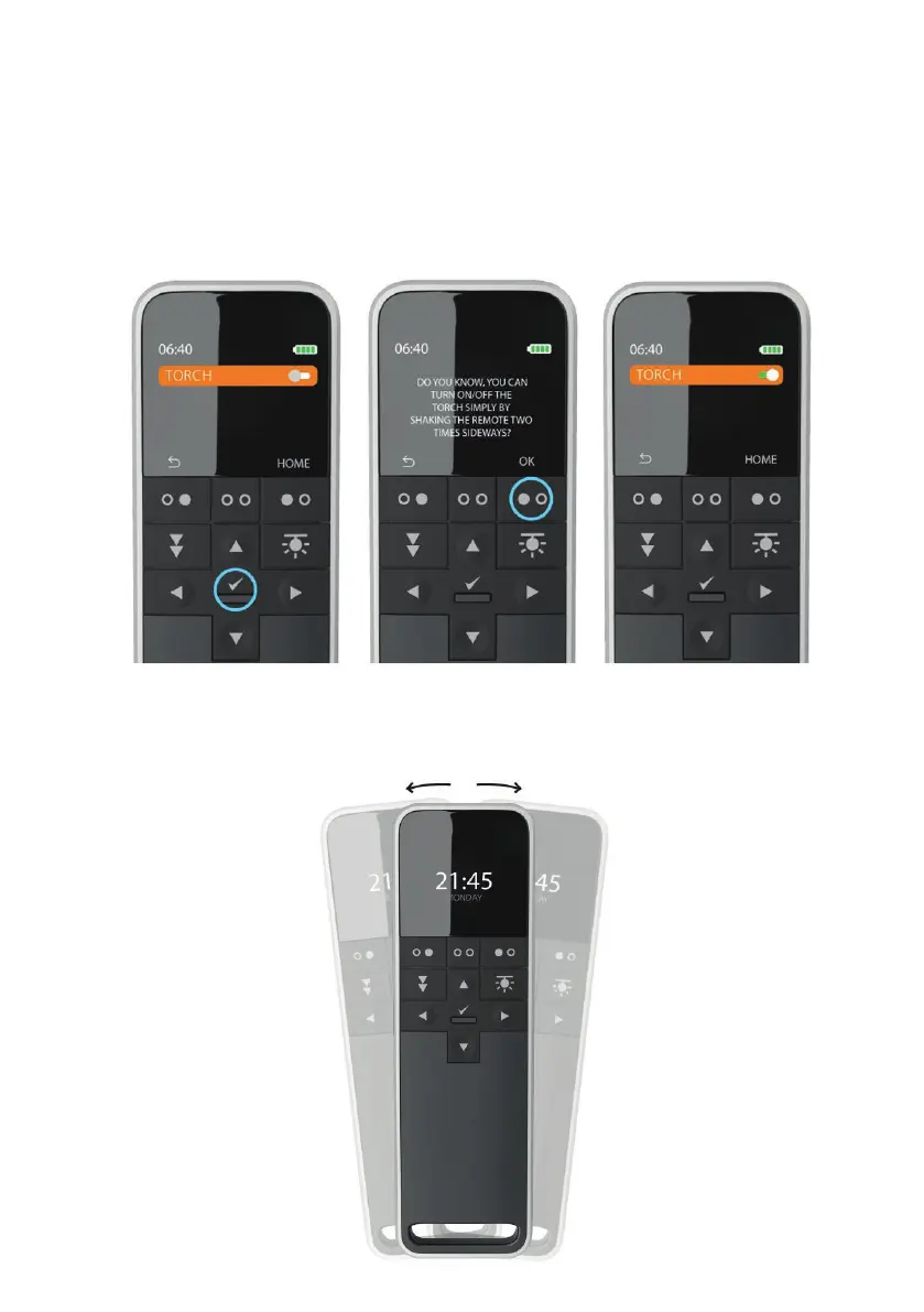 The torch can also be turned on directly from any screen. Simply shake the hand control sideways twice. To turn it off, simply