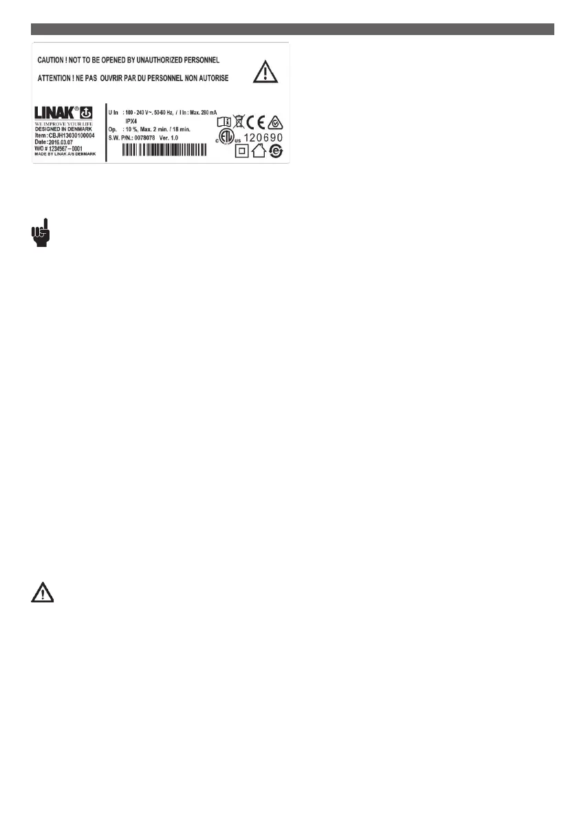 • Only an authorised LINAK service centre should change a battery in a CBJ Home. If a CBJ Home is opened and a battery is changed by