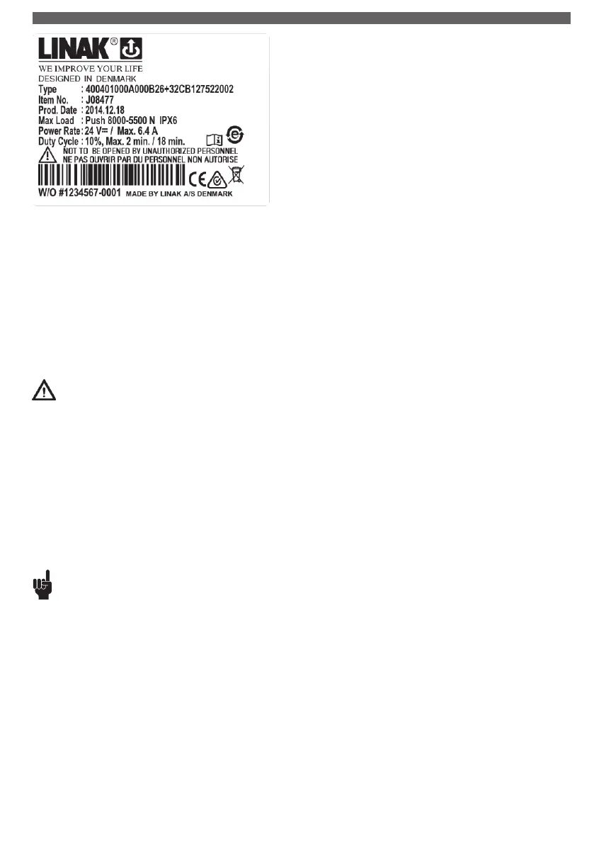 If the actuator does not work as intended, there is a risk of injury. Therefore, the actuator must immediately be sent to the nearest authorised LINAK