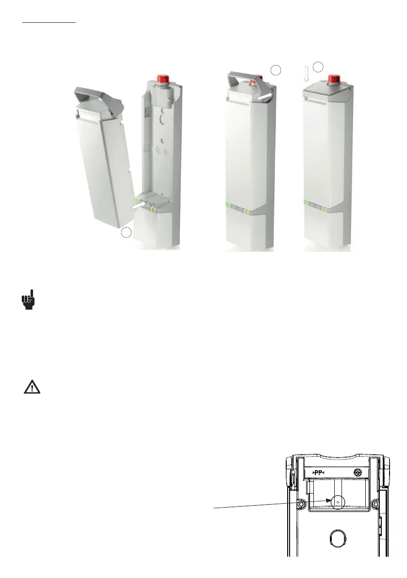 1) With open handle (1) - position battery base over the guide track and lower it in place