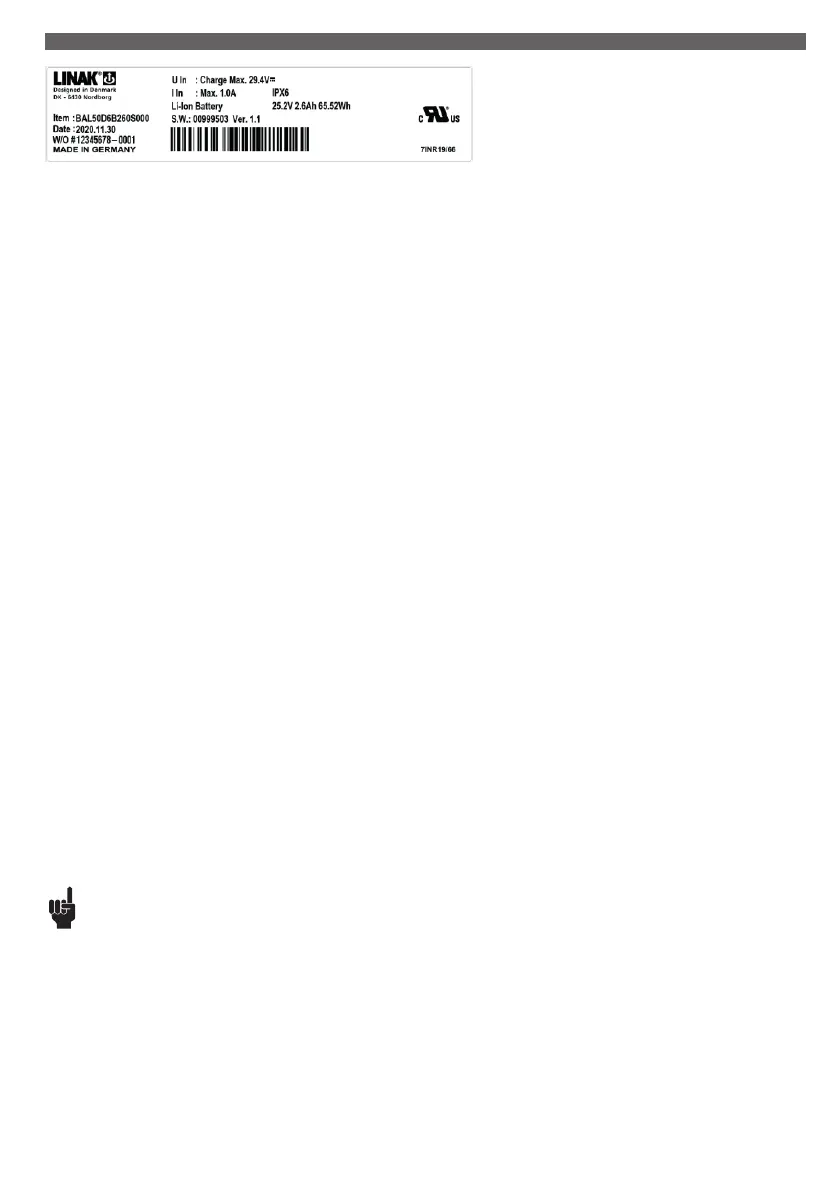 • Recharging during storage: First recharge of the battery must be no later than 12 months after production date stated on the label.