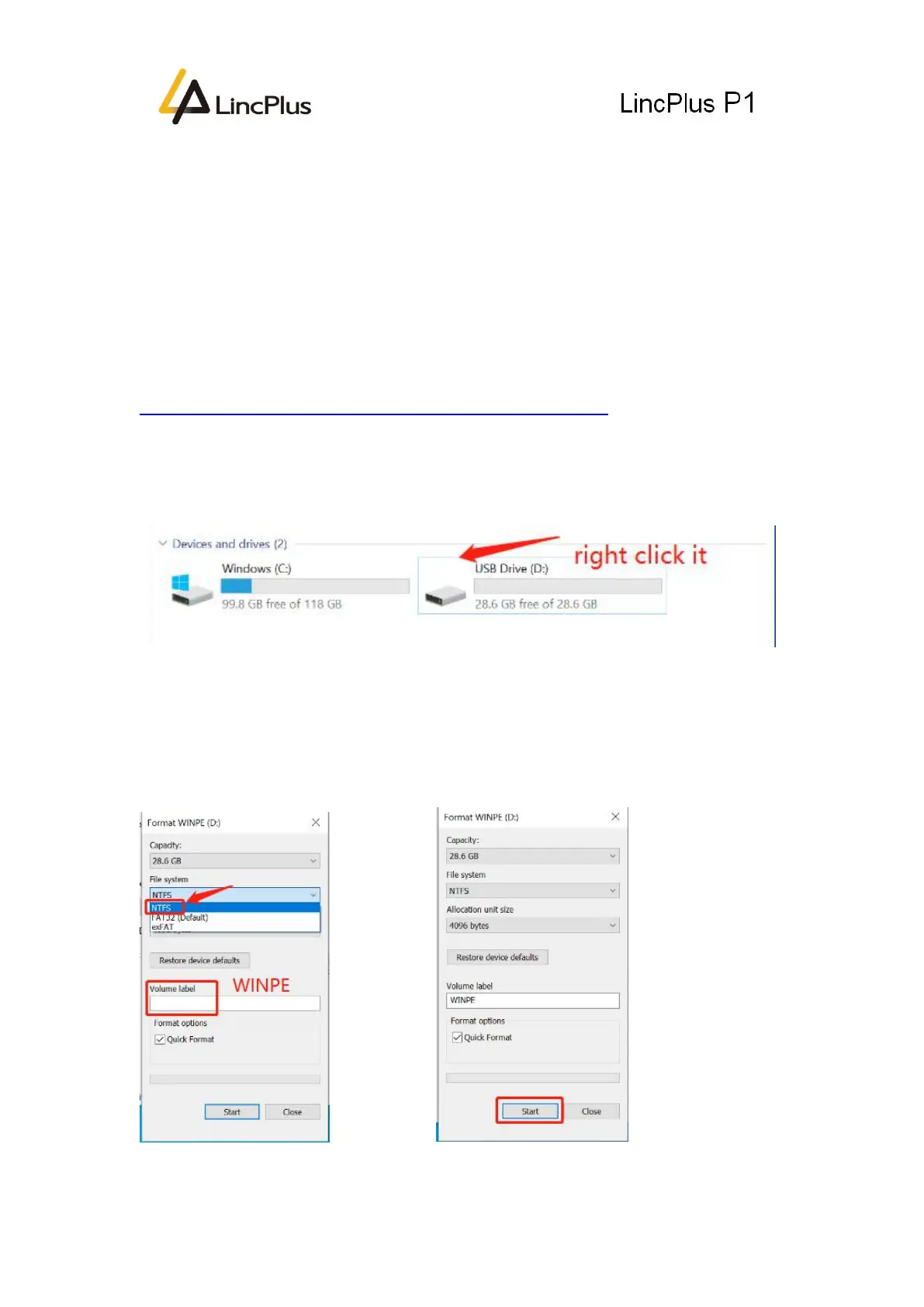 4. Choose the “NTFS” and set the USB flash drive’s label as “WINPE” , then click