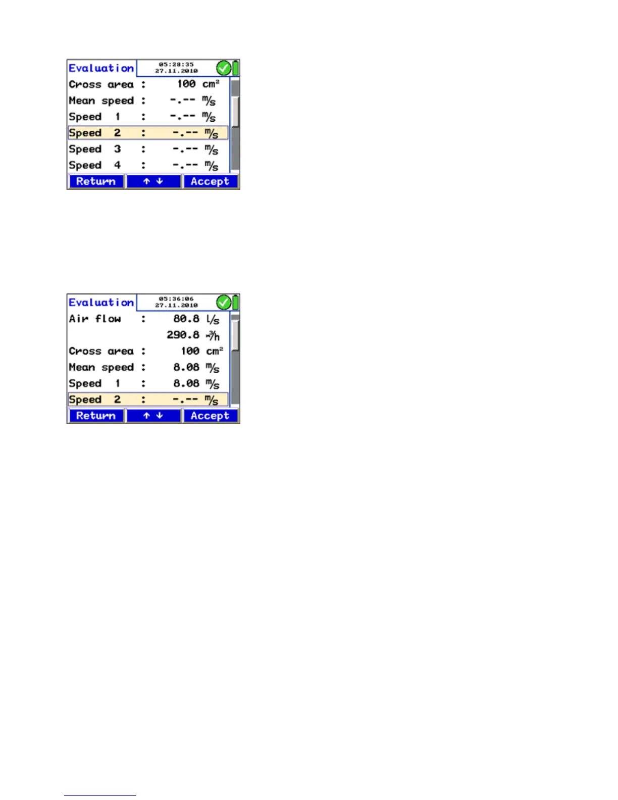 • Press "Accept" to capture the value as the velocity 1.