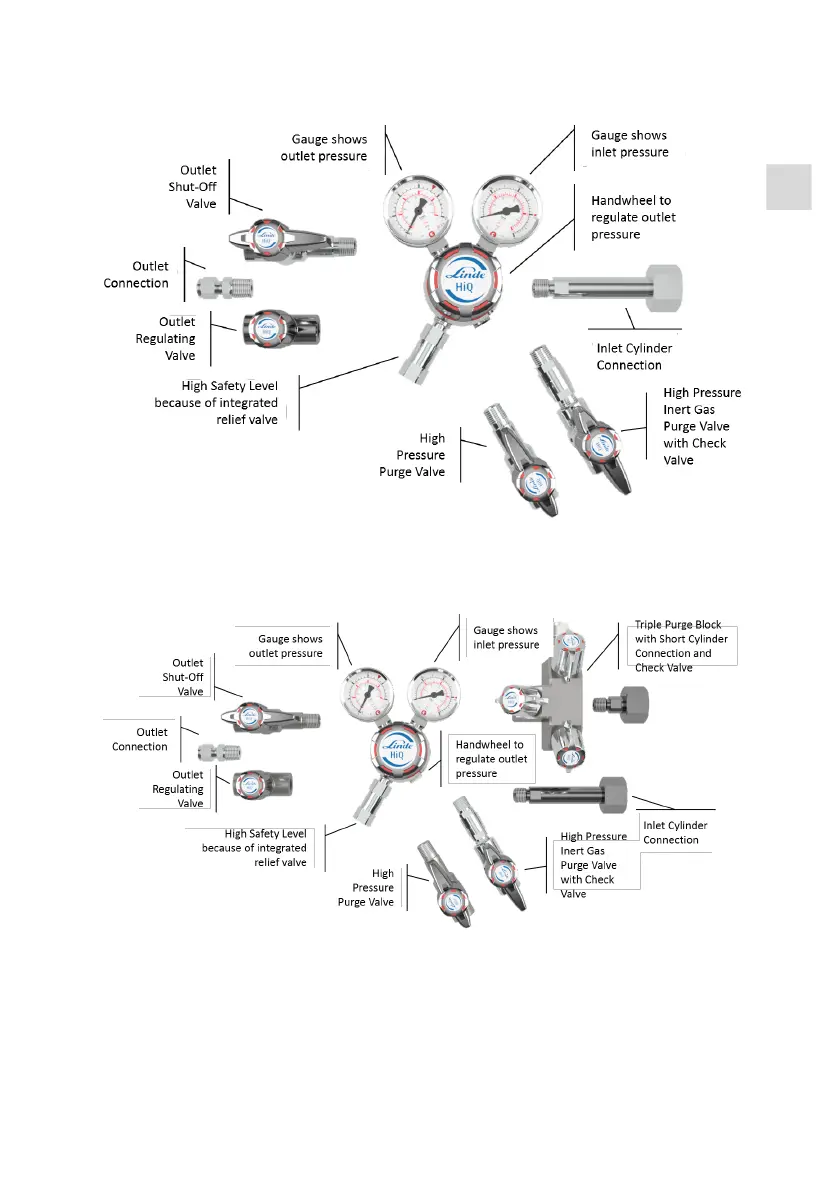 • Purge valve at inlet to purge high pressure site and/ or to depressurize before cylinder change.