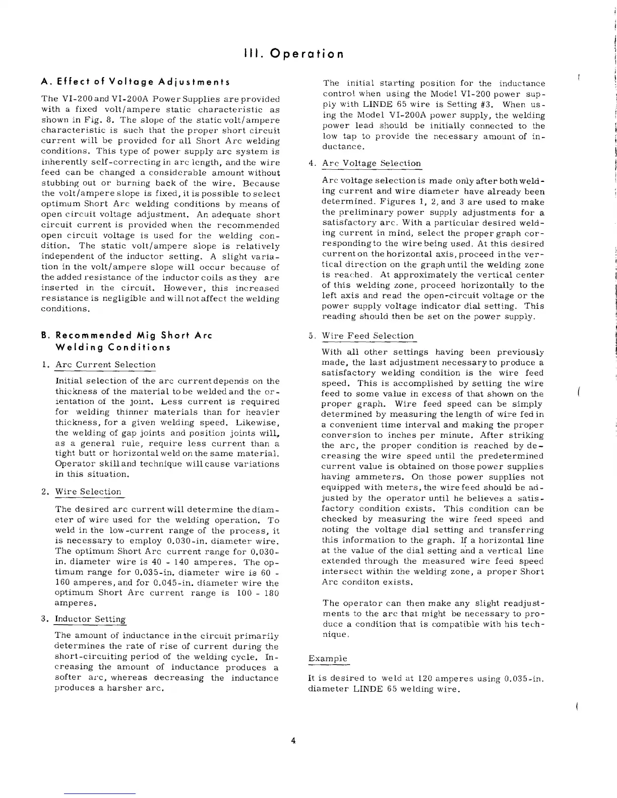 Linde VI-200 - Operation; Effect of Voltage Adjustments; Arc Current Selection; Wire Selection