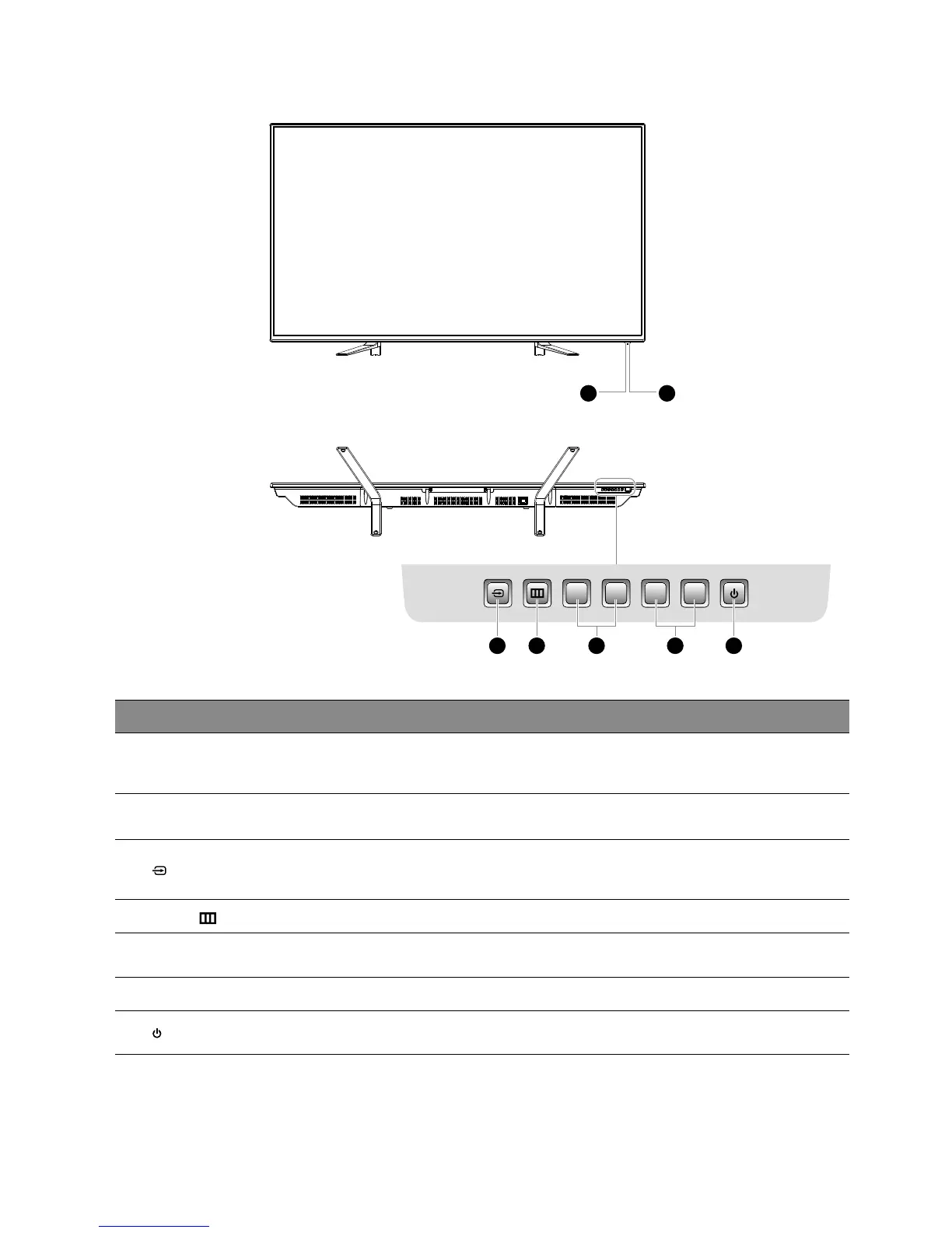 6 CH + / – Press to select a channel or select a sub-menu from the OSD menu.