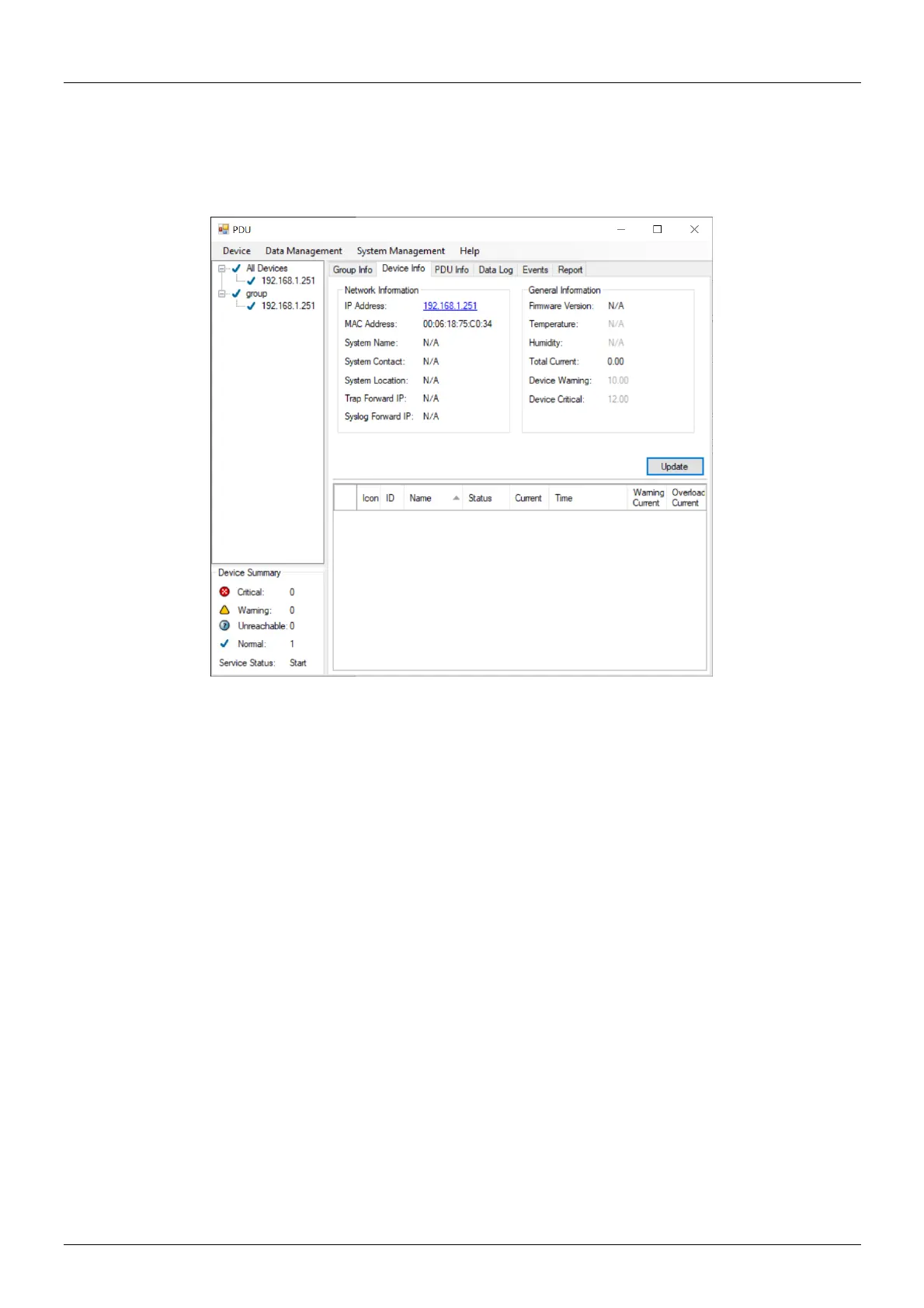▪ Warning current: Display the setting of the PDU for warning threshold.