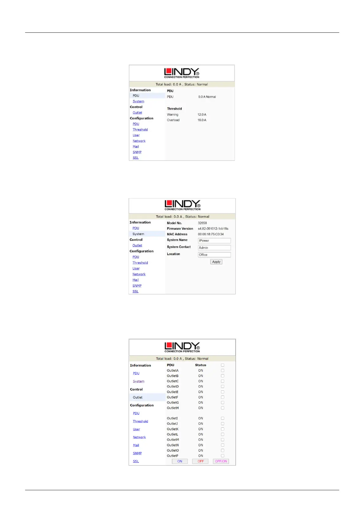 This tab provides an overview of the outlet status. Select the outlet by check box first and click the on or