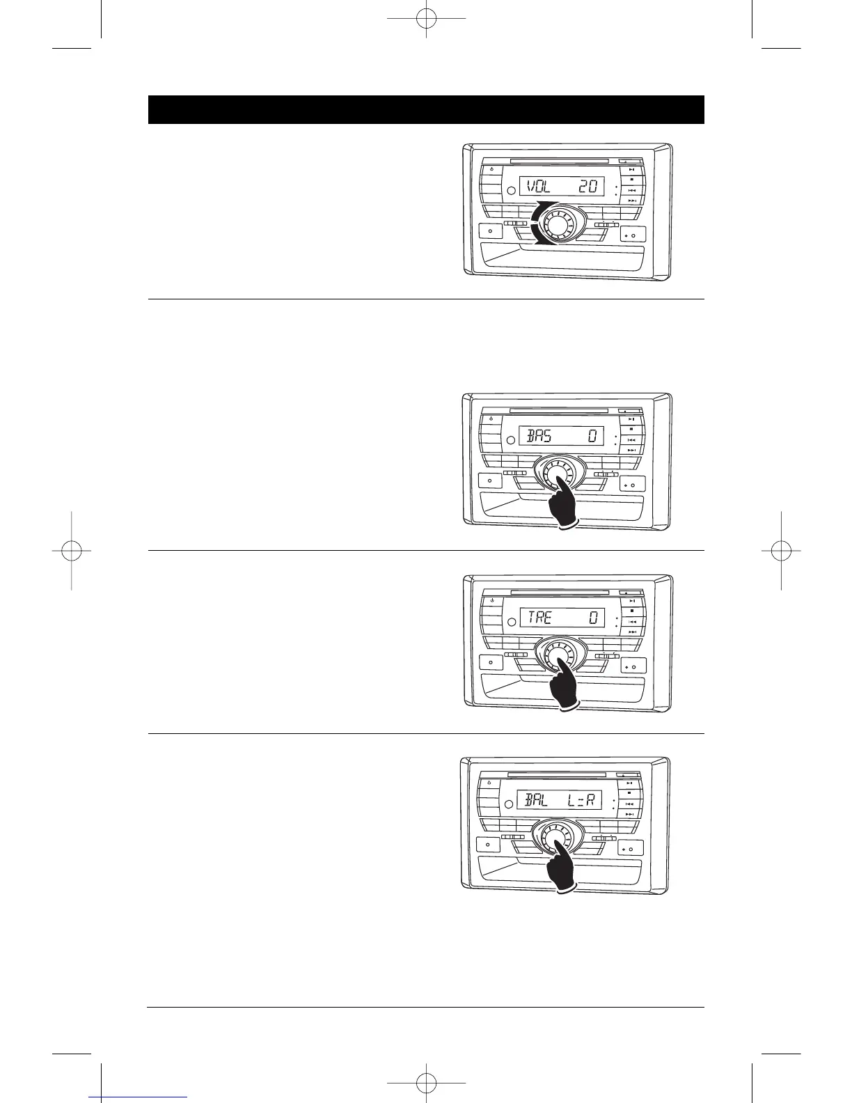 the following order: Bass, Treble, Balance and Volume.