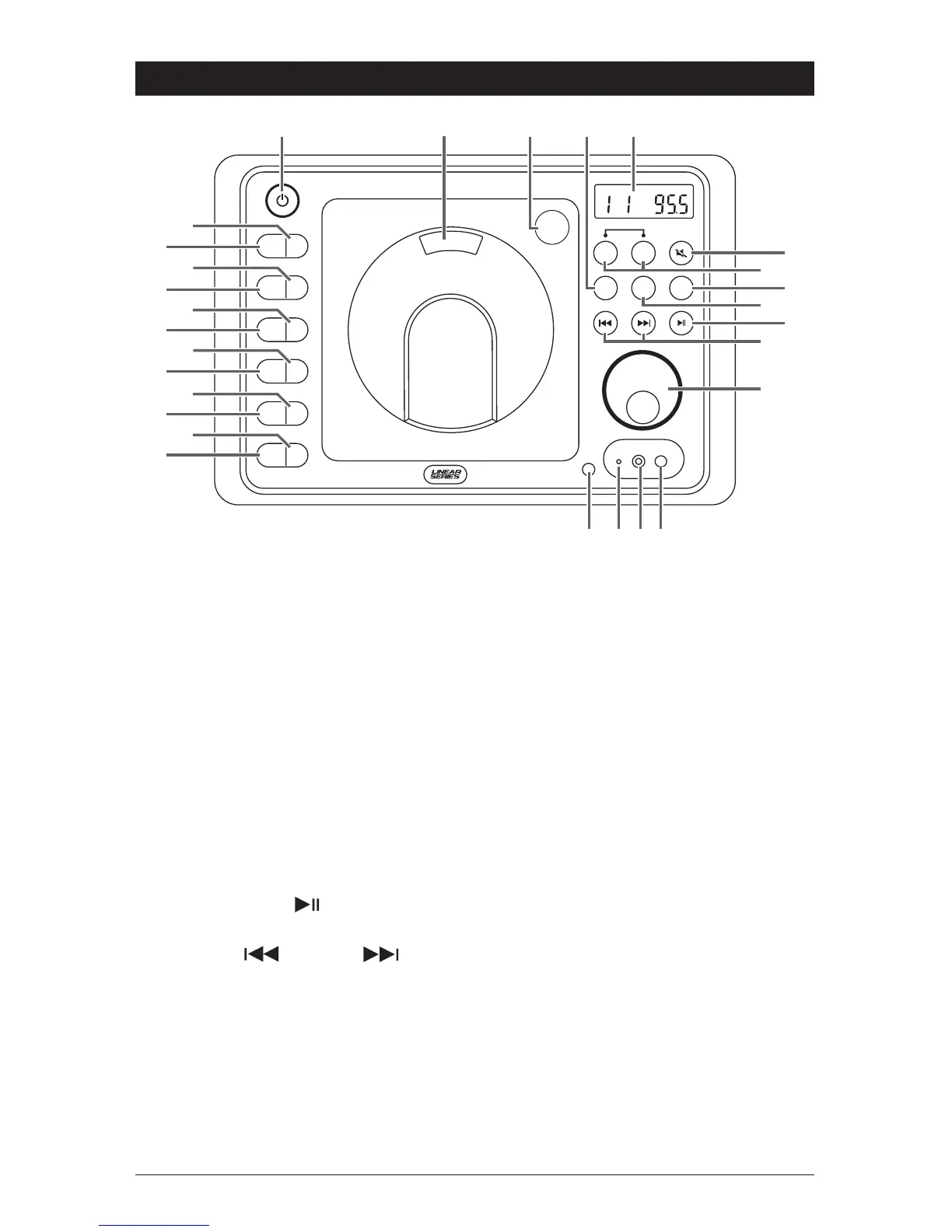10. Play/Pause Button ( ): Press to pause disc play, press again to resume play.
