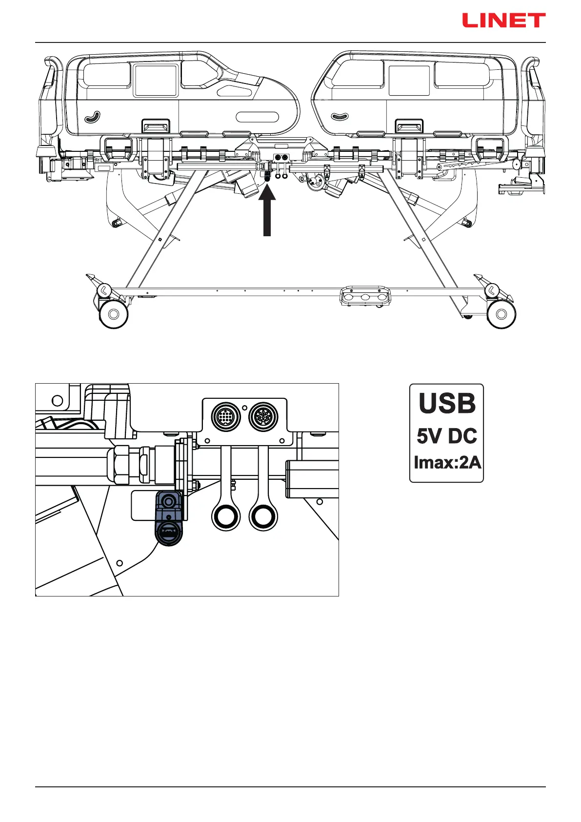 Fig. USB connector under the seat section of the bed with Plastic Siderails