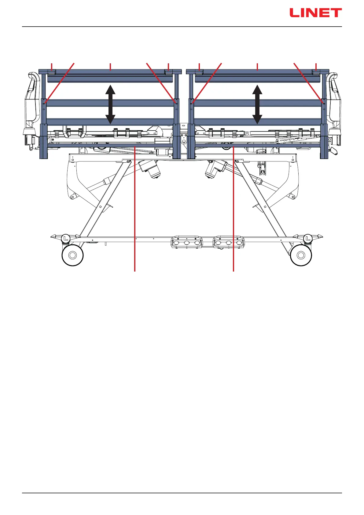 ► Hold both Siderail Release Mechanisms and push red buttons at both upper ends of selected telescopic siderail.