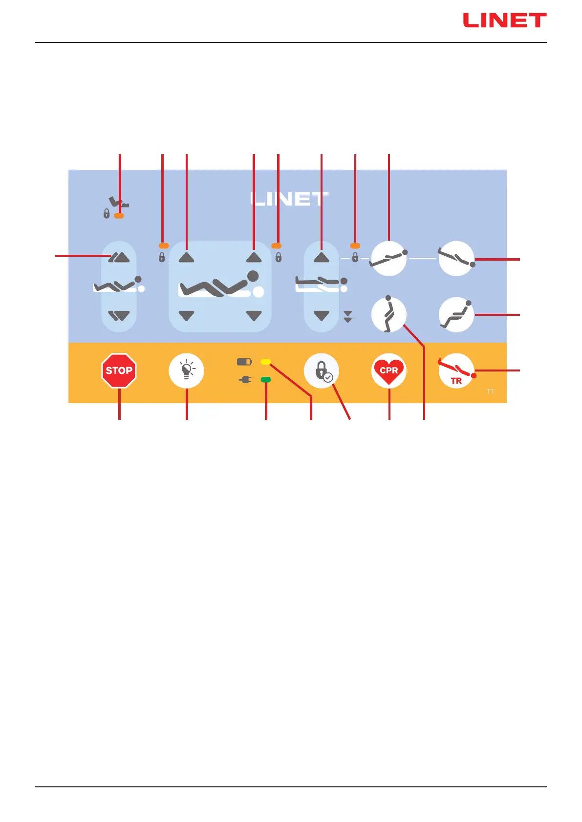 8. Bed Height Adjustment Lock LED Indicator / Trendelenburg Tilt Lock LED Indicator / Reverse-Trendelenburg Tilt