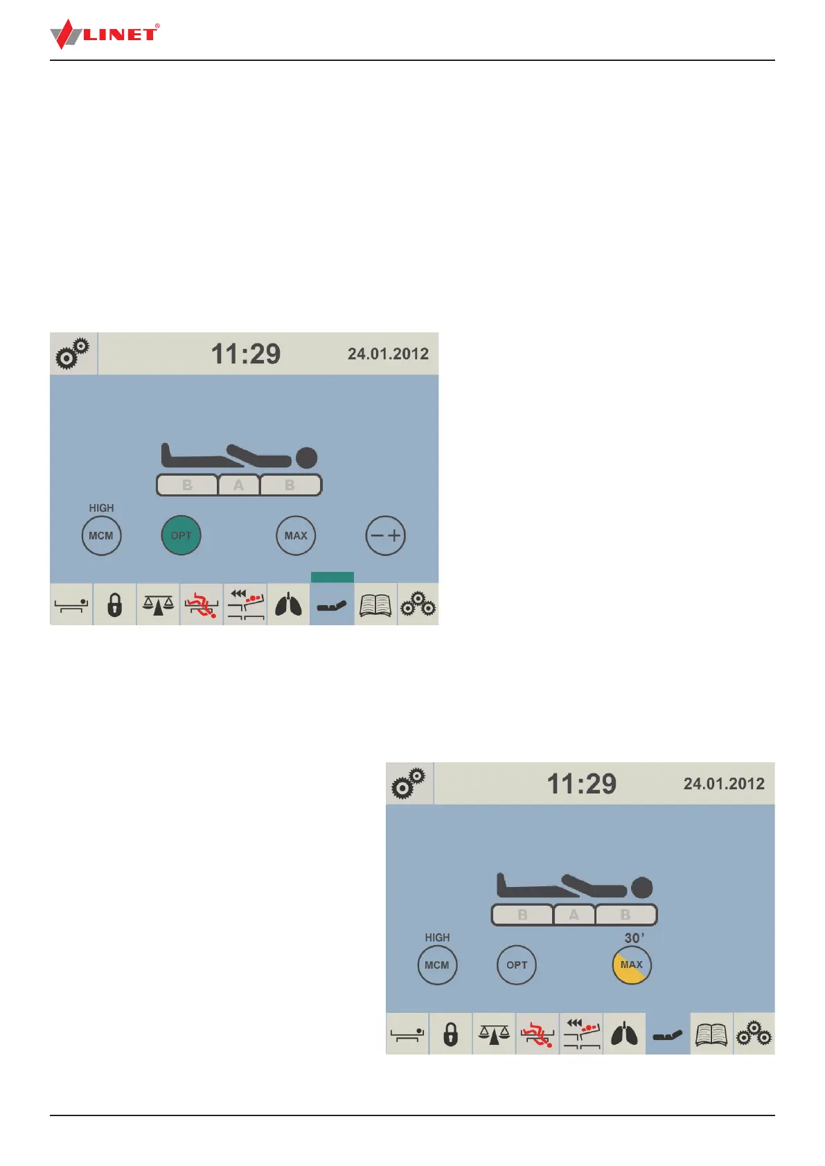 NOTE: During pressure optimization the OPT icon is ashing. Fully green OPT icon and green strip above mattress icon indicate