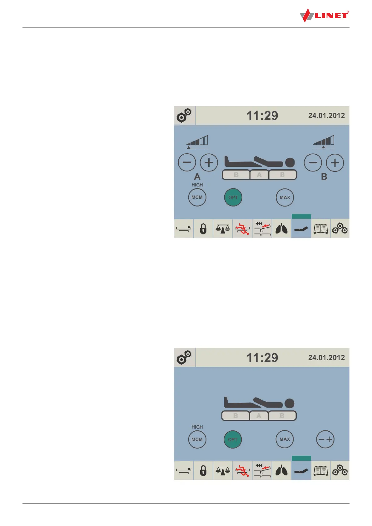 The mattress pressure can be adjusted based on the patient´s needs, press -+ icon. The pressure can be separately adjusted in