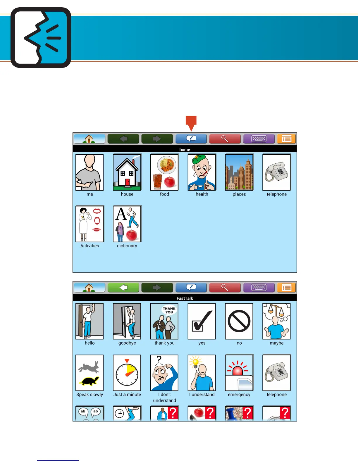The FastTalk page contains easily accessed words and phrases to help quickly initiate and maintain conversation.