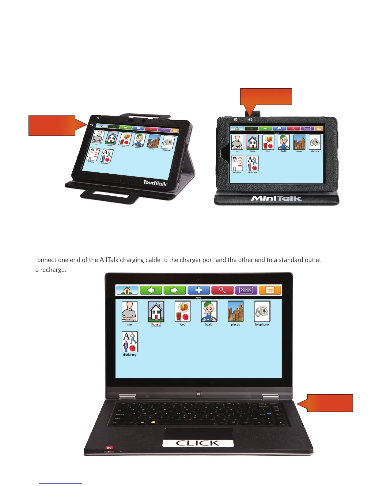 Lingraphica TouchTalk - Getting Started; Volume on Touch Talk and MiniTalk; Charging AllTalk