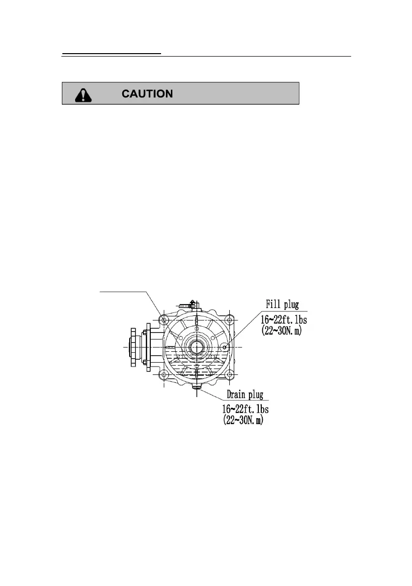 Reinstall the fill plug. Tighten securely to 22~30 Nm.