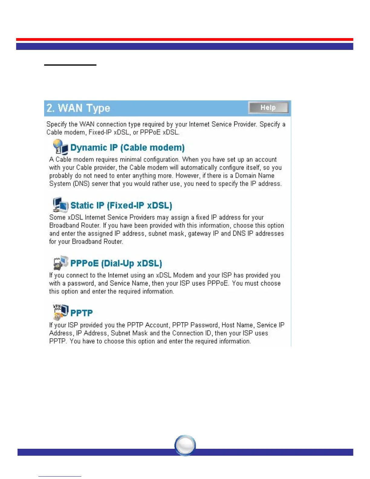 Linkskey LKR-604 - WAN Type Selection; Dynamic IP (Cable modem); Static IP (Fixed-IP xDSL); PPPoE (Dial-Up xDSL)