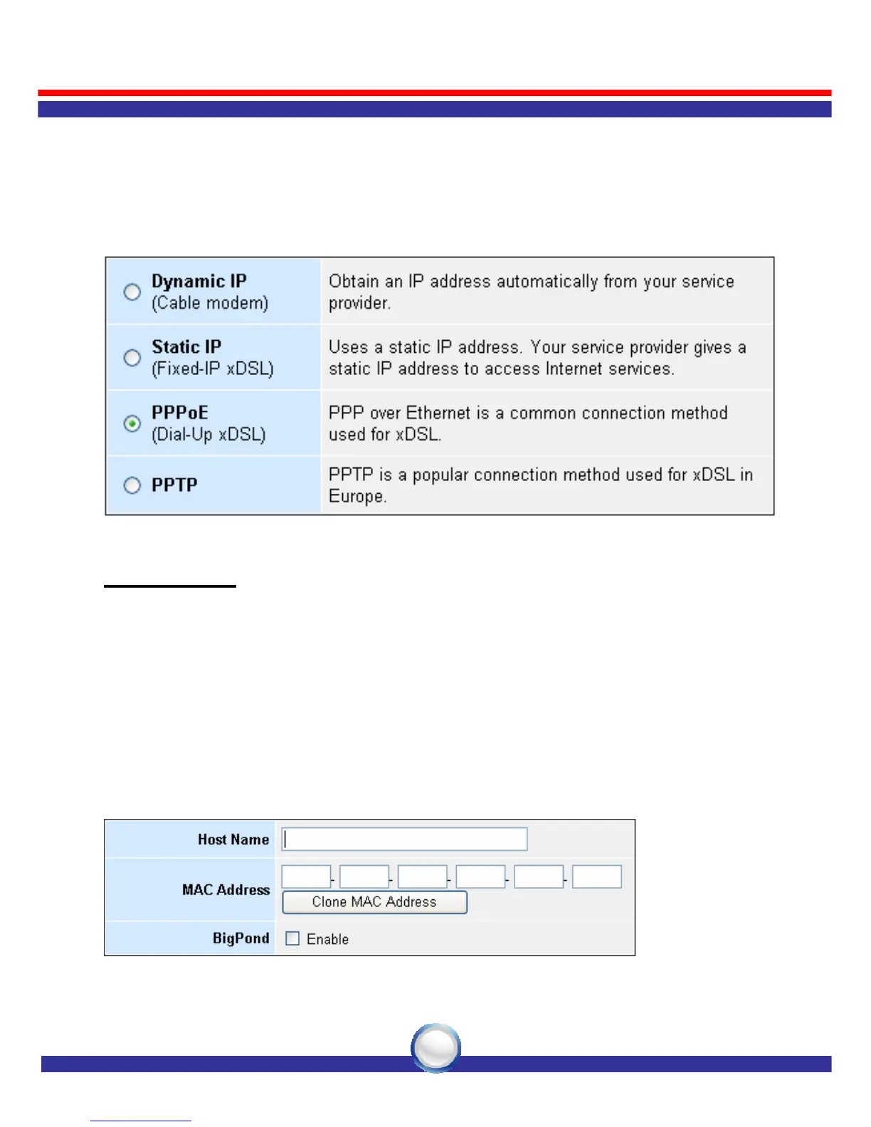 Internet connections: Dynamic IP Address, Static IP Address, PPPoE,