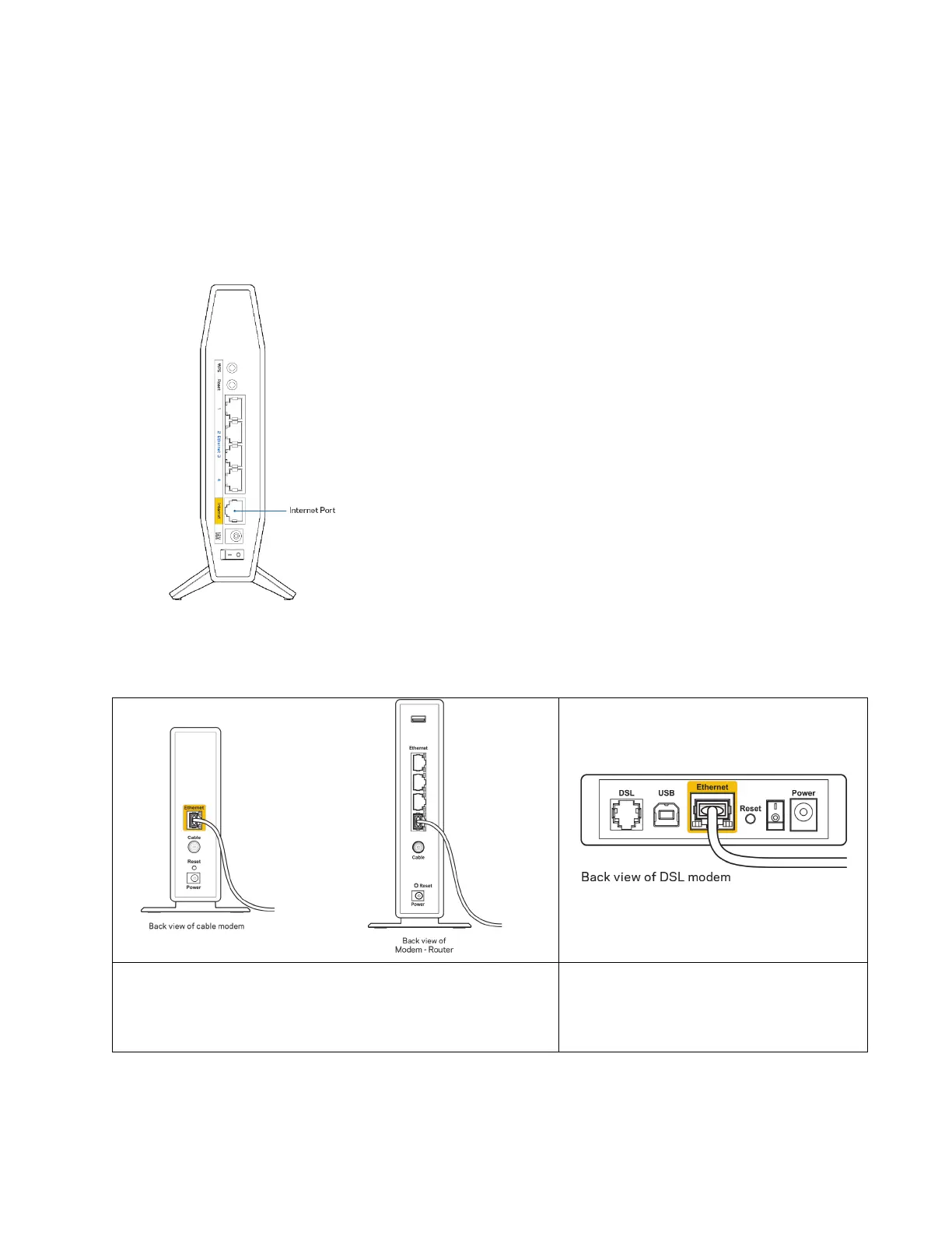 이더넷 또는 인터넷 케이블(또는 라우터와 함께 제공되는 것과 같은 케이블)이 라우터 후면의 노란색
