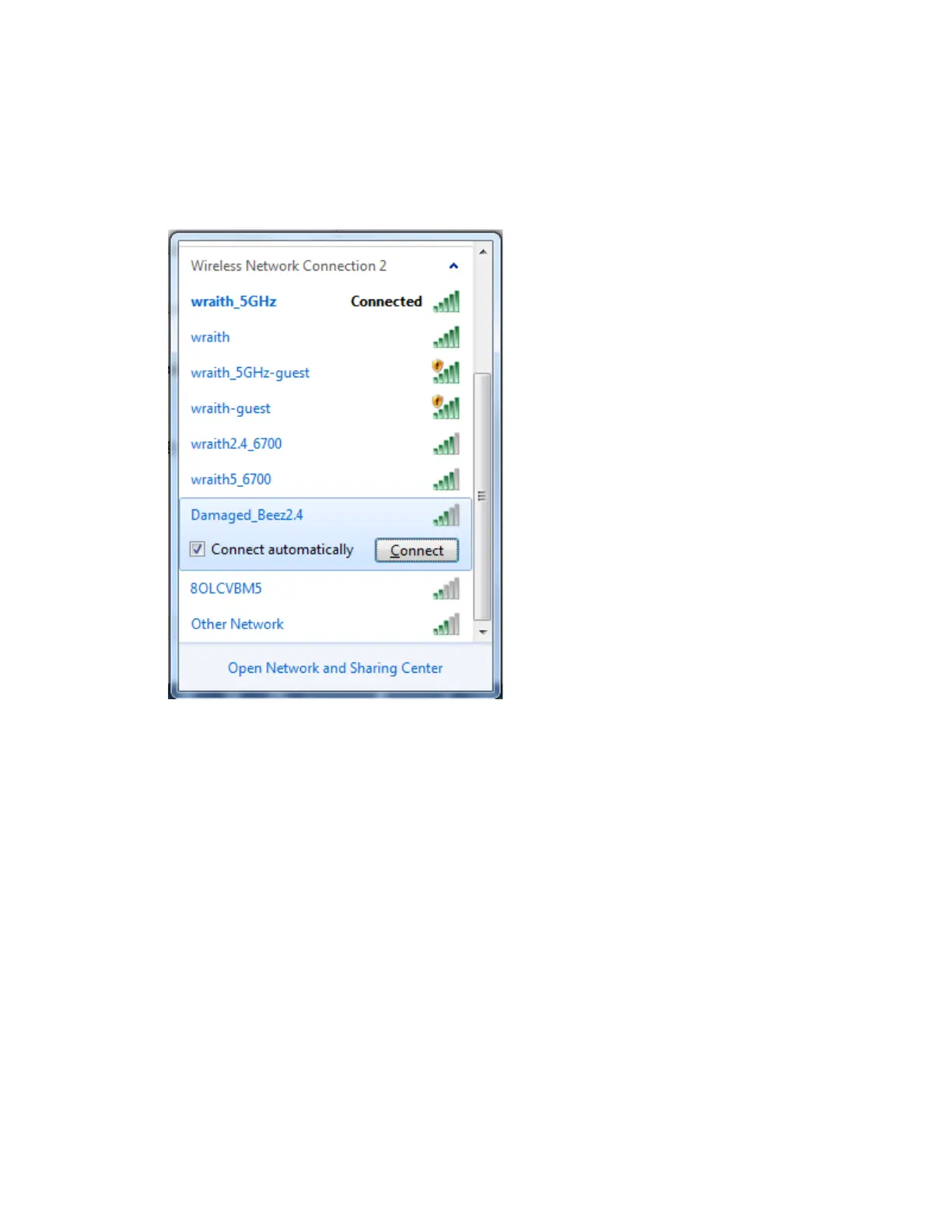 “wraith_5GHz”的无线网络。在此示例中,我们选择了名为“Damaged_Beez2.4”的Linksys E系列路