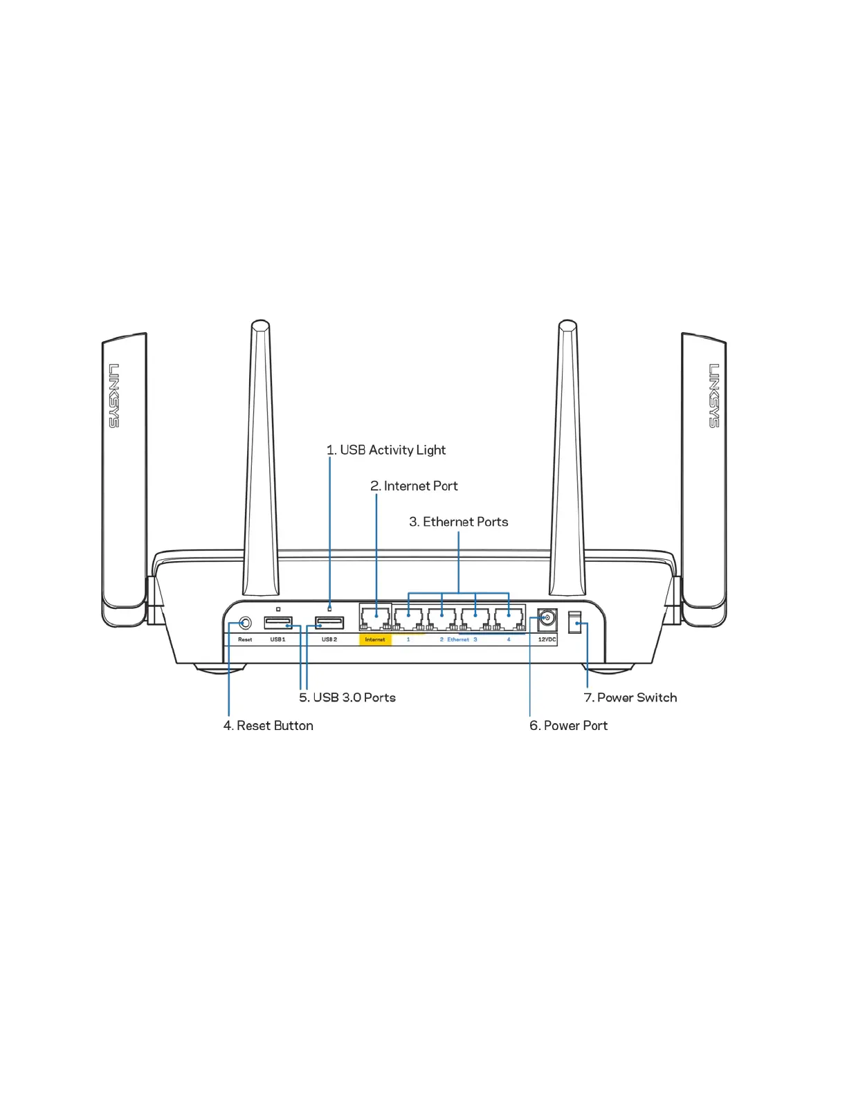 Logo Linksys iluminat — Se aprinde intermitent în timpul inițializării routerului. Când logoul este alb continuu,