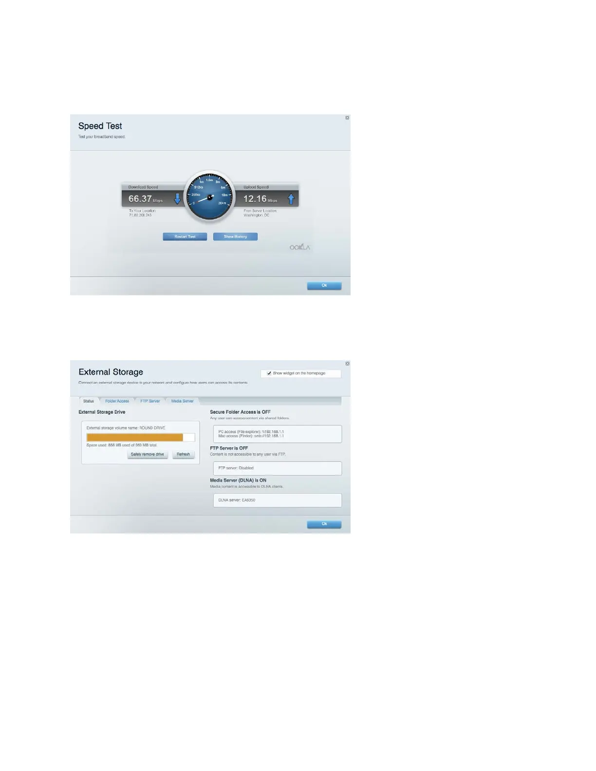 允许您访问附加U盘(不含)并设置文件共享、媒体服务器和FTP访问。