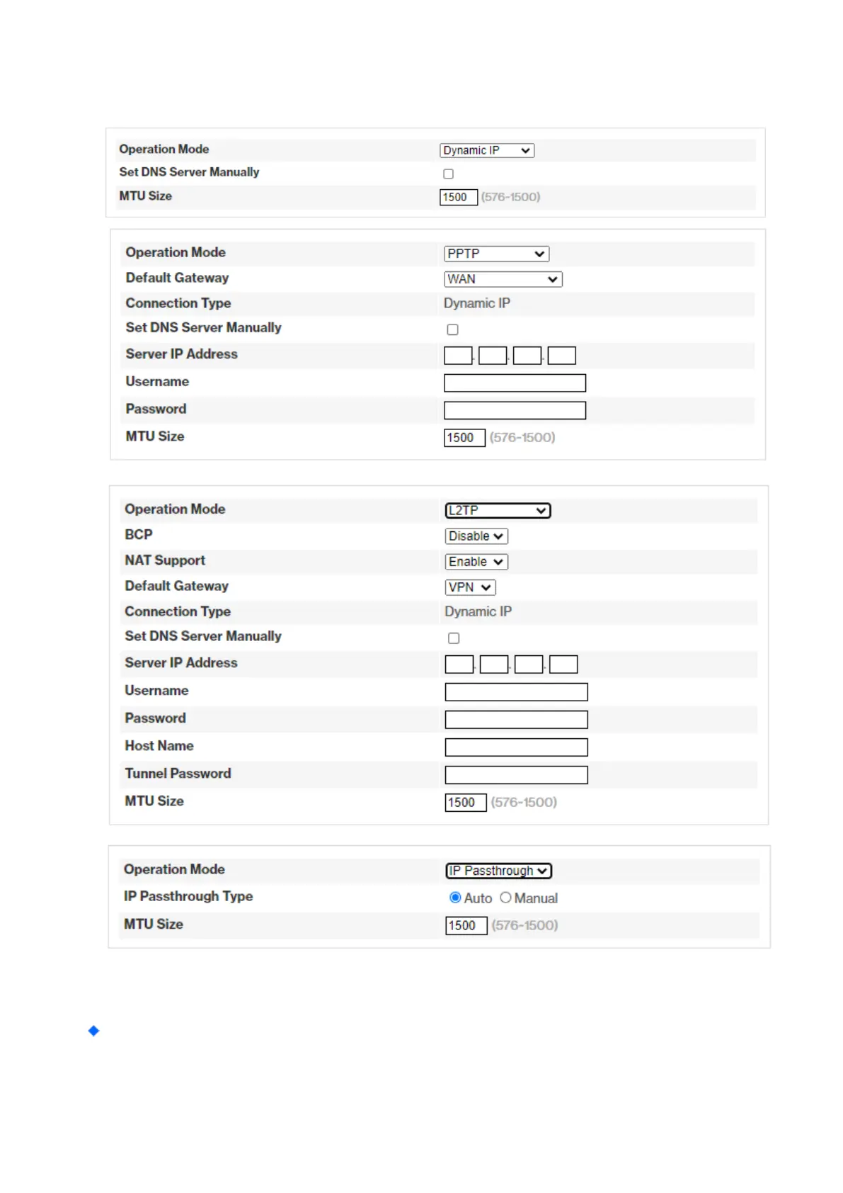 Operation Mode: Possible to state Dynamic IP, PPTP, L2TP, or IP Passthrough.