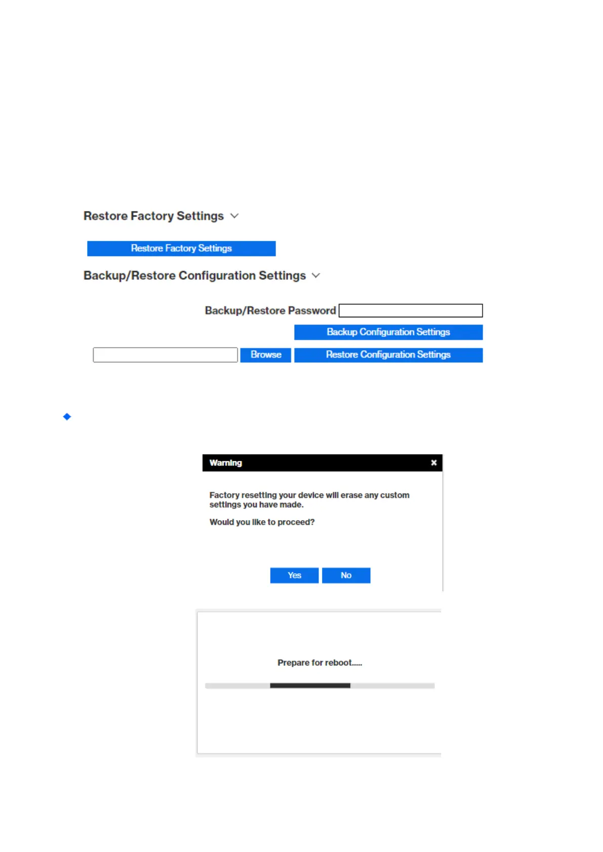 Restore Factory Settings: Click “Restore Factory Settings” button to clear all users’ configuration and