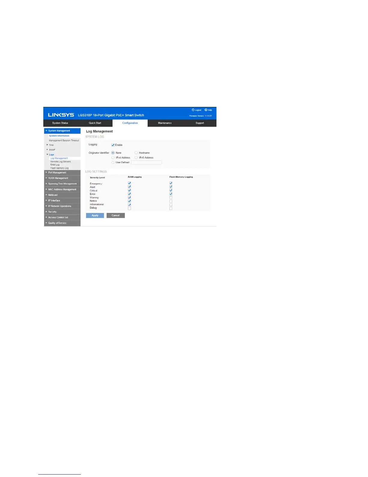 You can select different severity levels for RAM and Flash logs. These logs are displayed in the