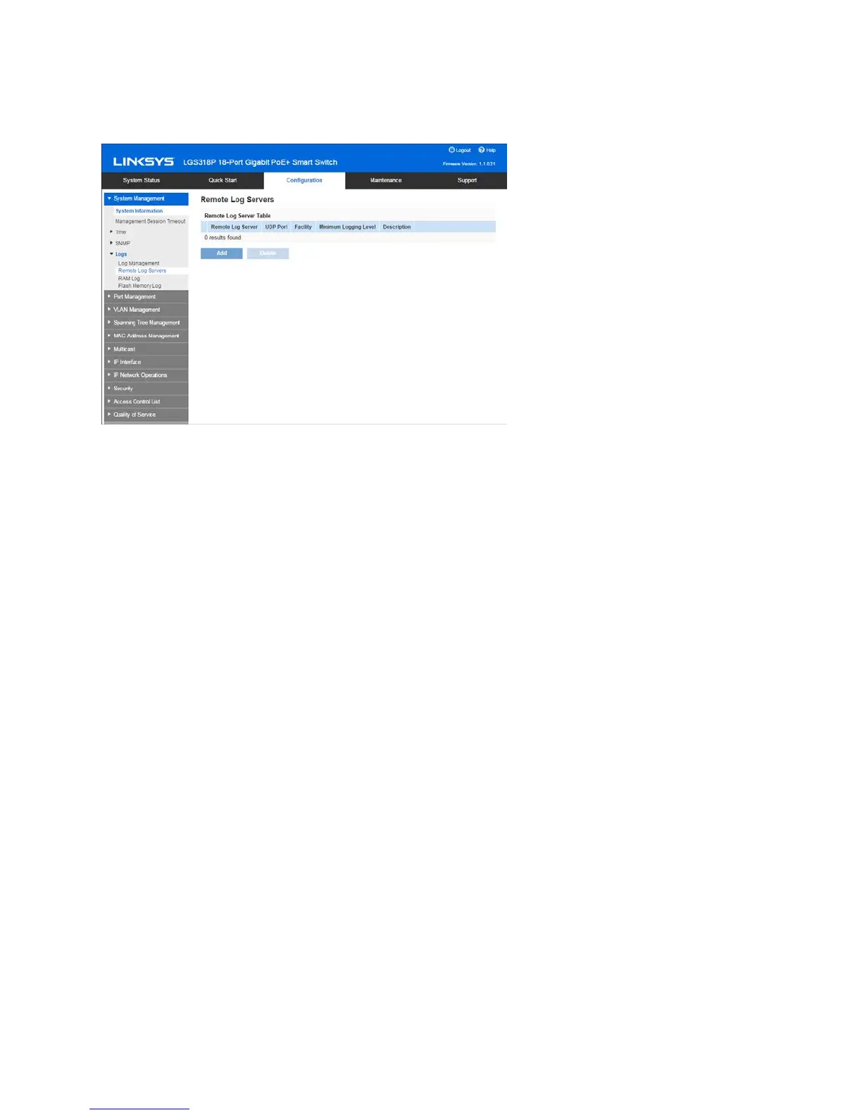 Click Configuration > System Management > Logs > Remote Log Servers.