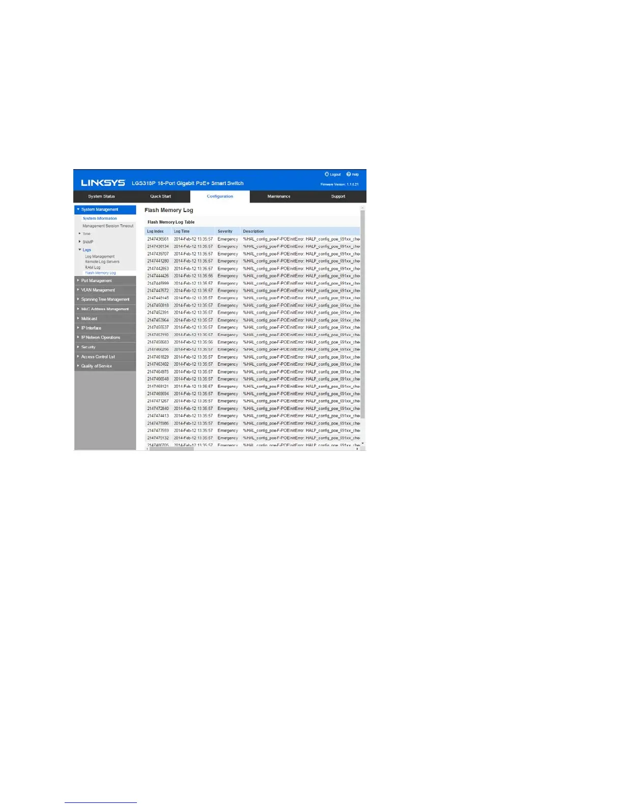 Click Configuration > System Management > Logs > Flash Memory Log.