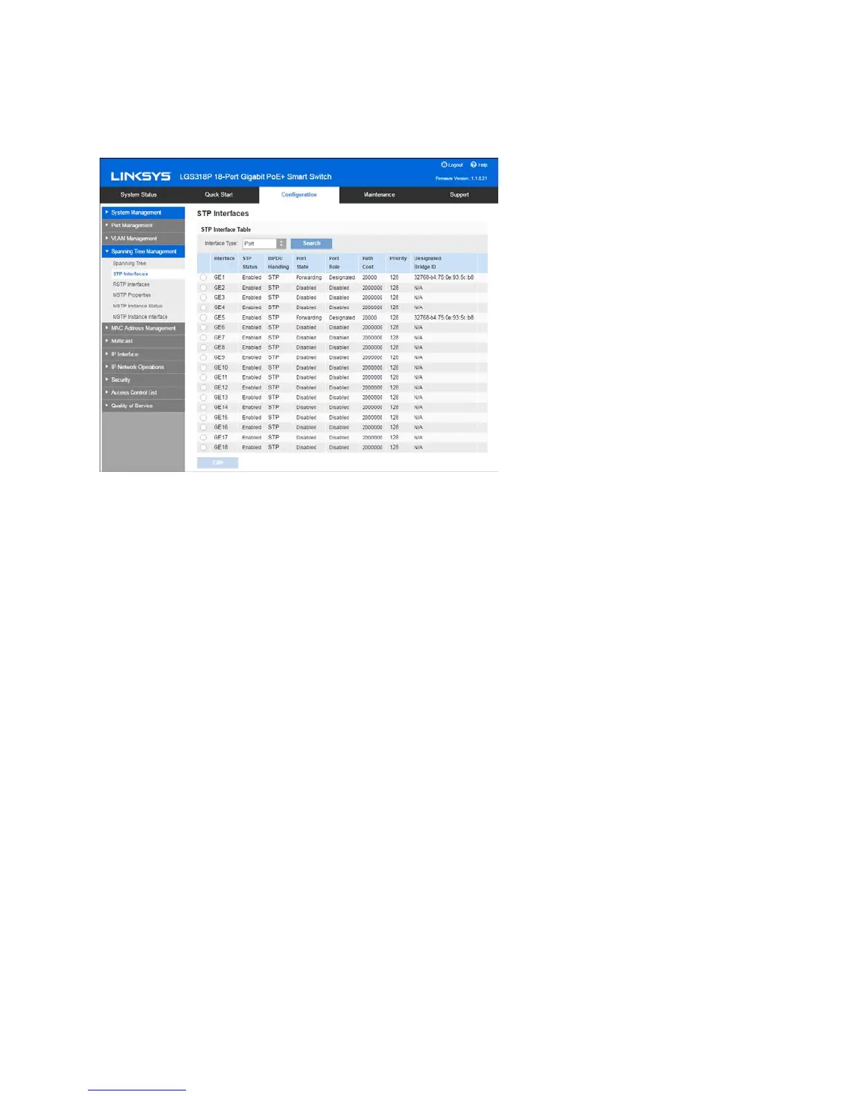 Click Configuration > Spanning Tree Management > STP Interfaces.