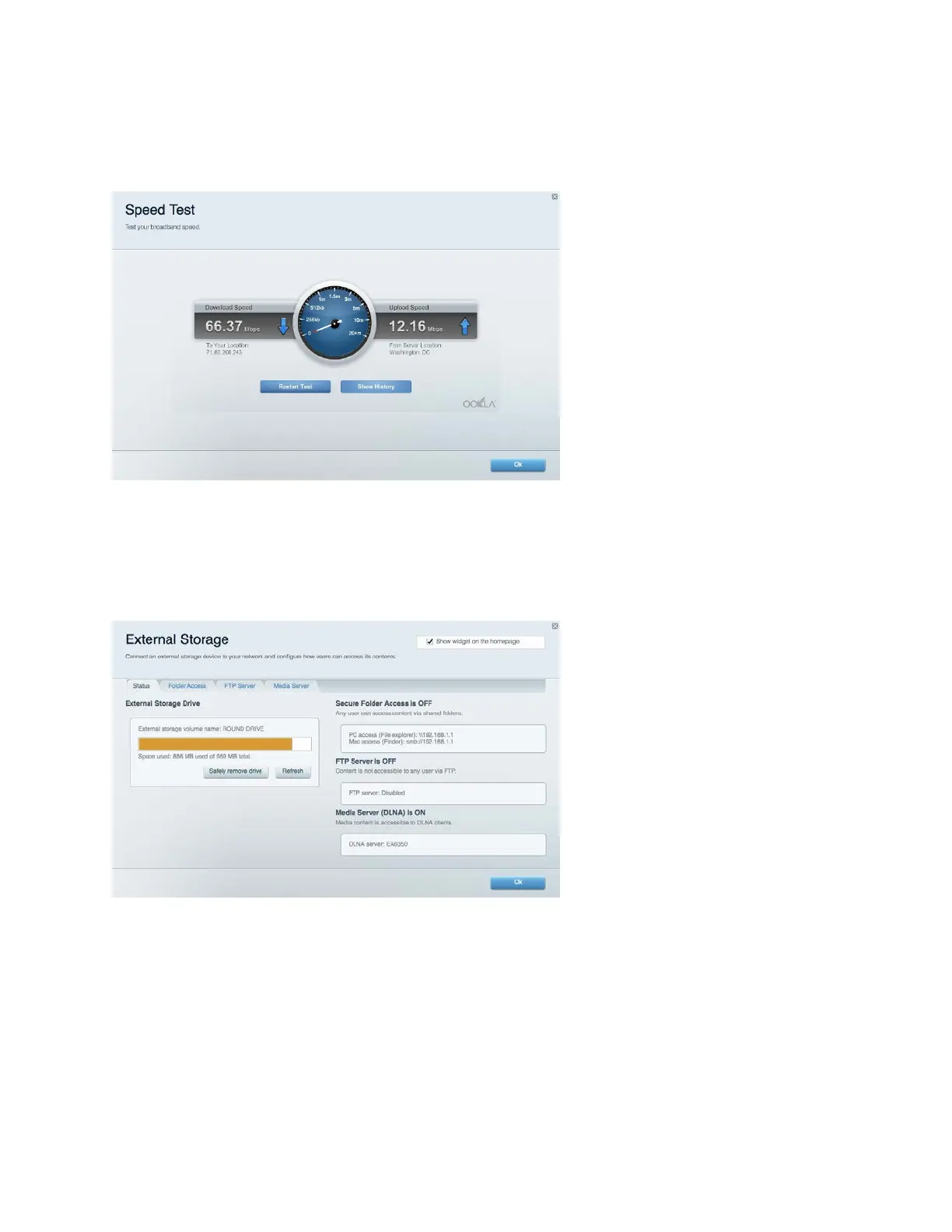 Leidžia pasiekti prijungtą USB diską (nepridedamas) ir nustatyti failų bendrinimą, medijos serverį ir