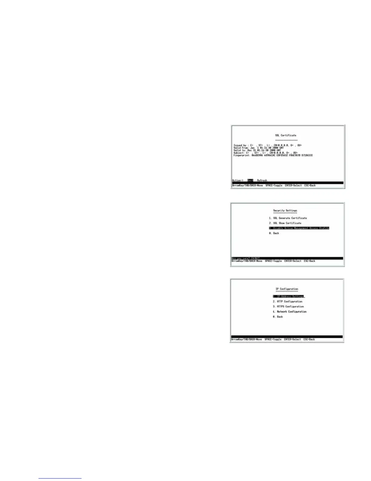 The IP Configuration screen displays these choices: the Switch’s IP Address Settings, HTTP, HTTPS Configuration