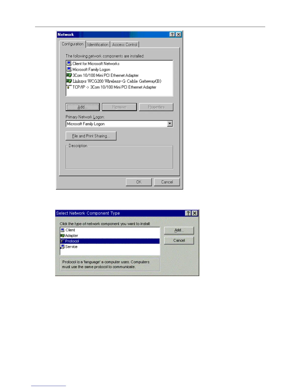 4. The Select Network Component Type dialog box will show up. Click ”Protocol”, and then