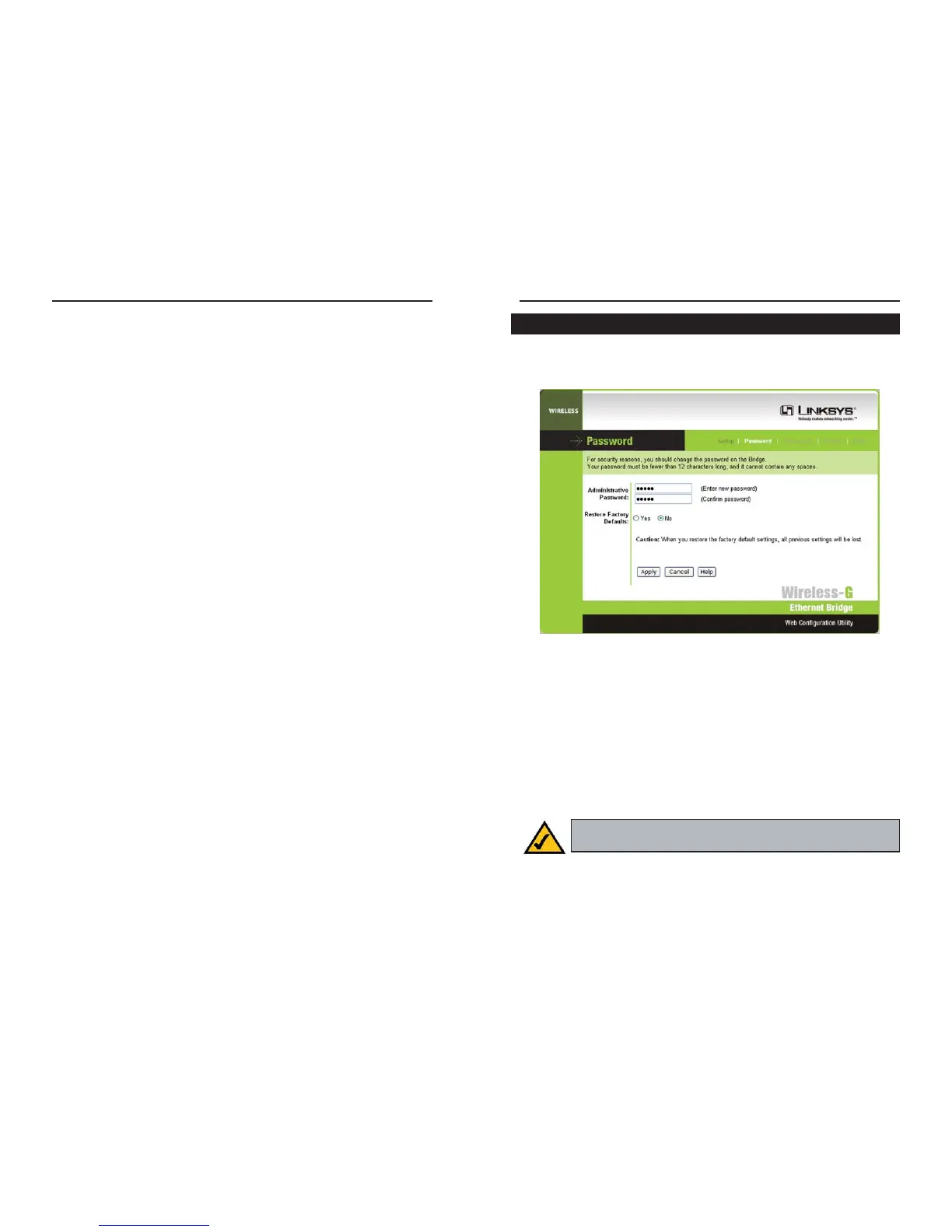 The Password screen lets you change the Bridge’s Password and restore the fac-