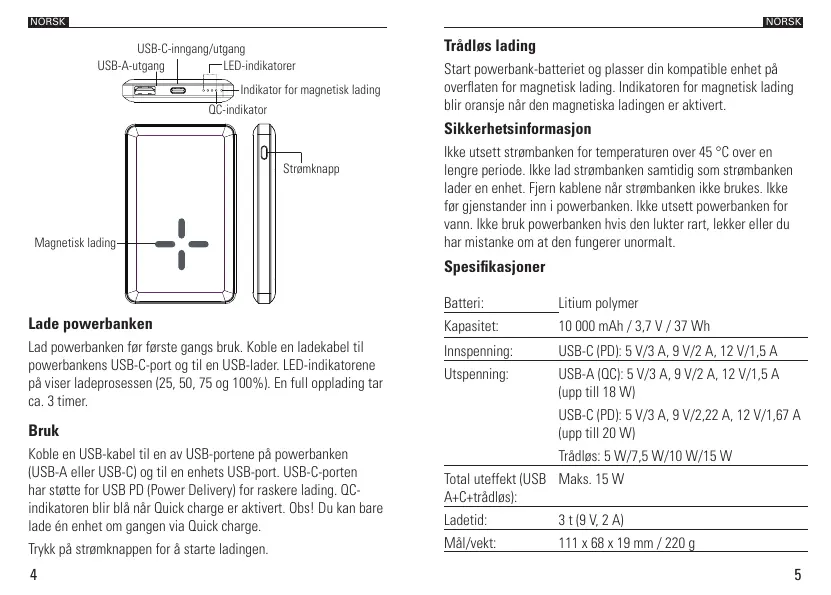 lader en enhet. Fjern kablene når strømbanken ikke brukes. Ikke