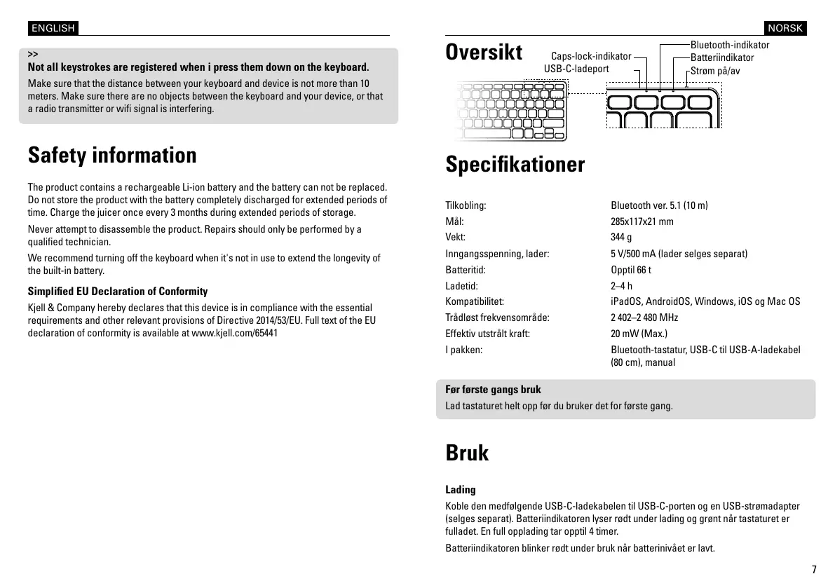 (selges separat). Batteriindikatoren lyser rødt under lading og grønt når tastaturet er