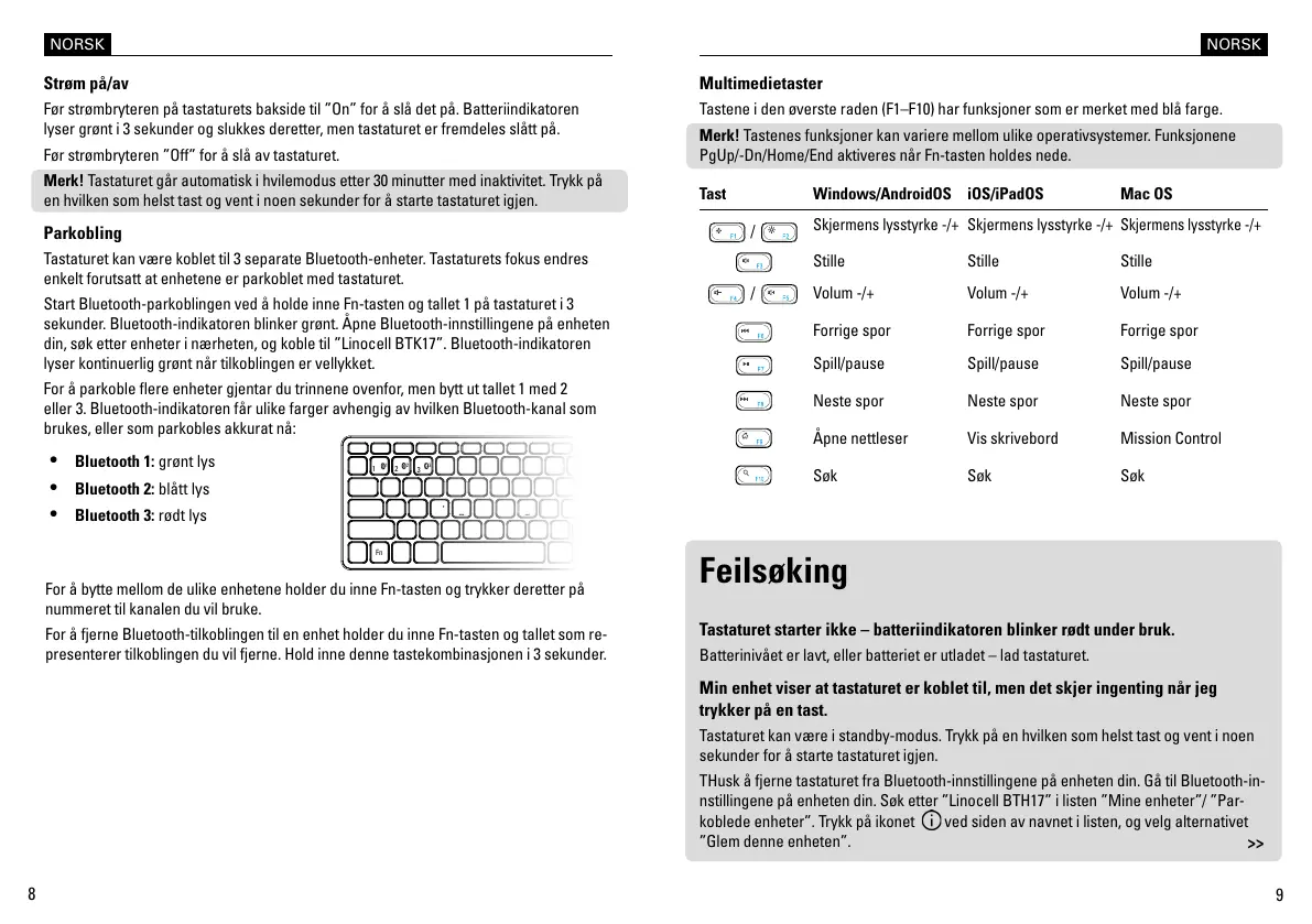 Tastaturet kan være koblet til 3 separate Bluetooth-enheter. Tastaturets fokus endres