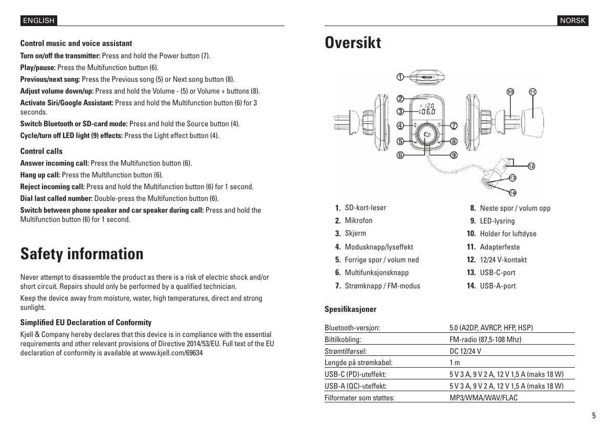 USB-A (QC)-uteffekt: 5 V 3 A, 9 V 2 A, 12 V 1,5 A (maks 18 W)