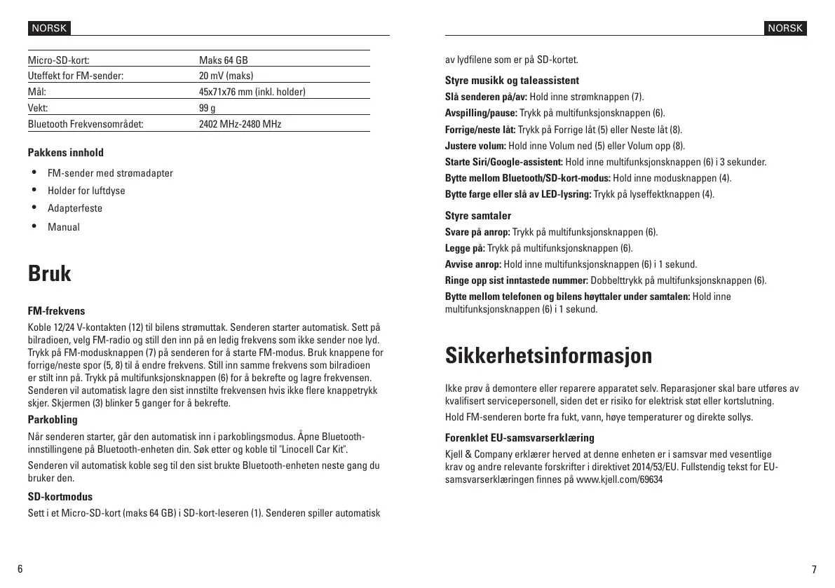 Trykk på FM-modusknappen (7) på senderen for å starte FM-modus. Bruk knappene for