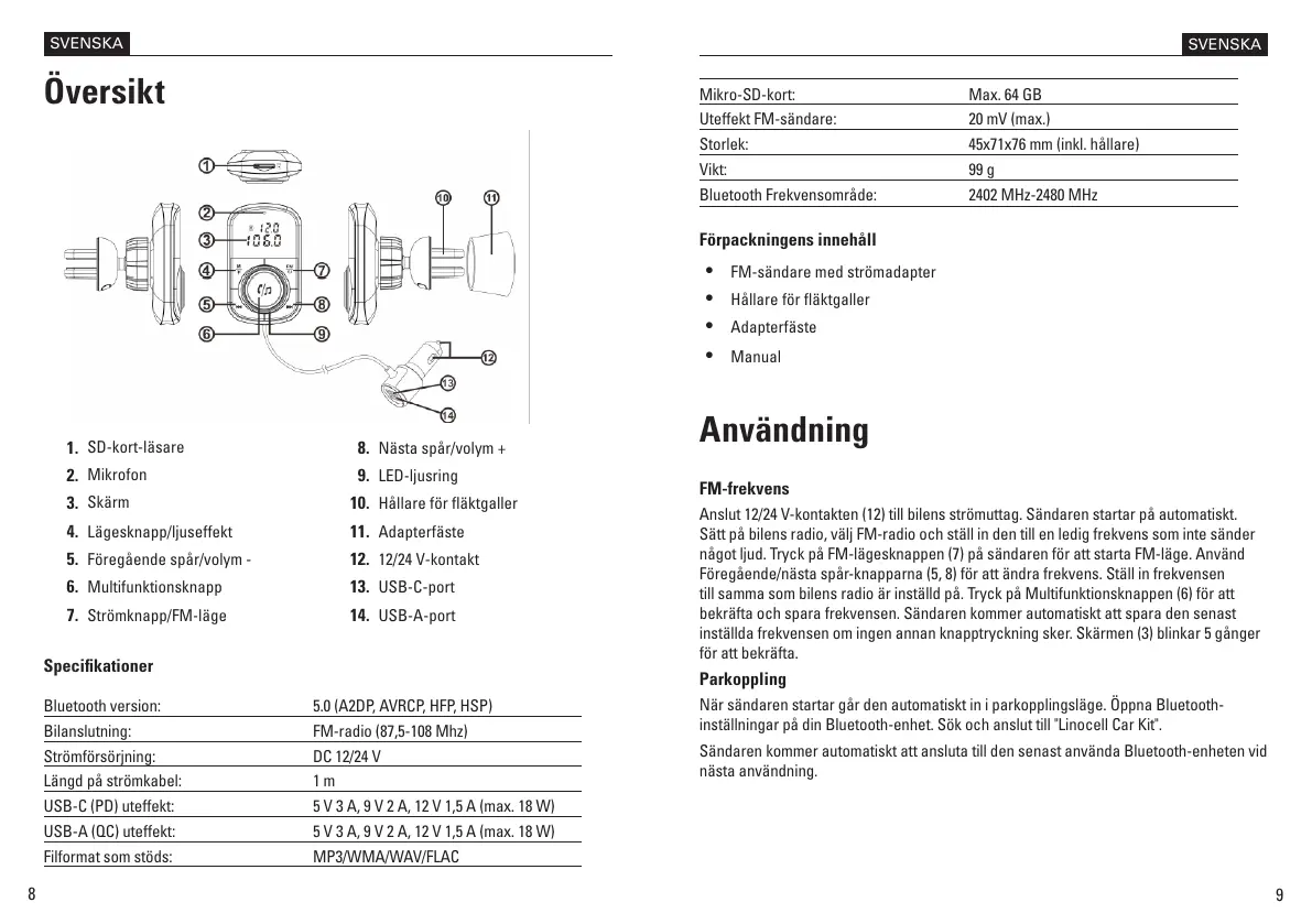 Anslut 12/24 V-kontakten (12) till bilens strömuttag. Sändaren startar på automatiskt.