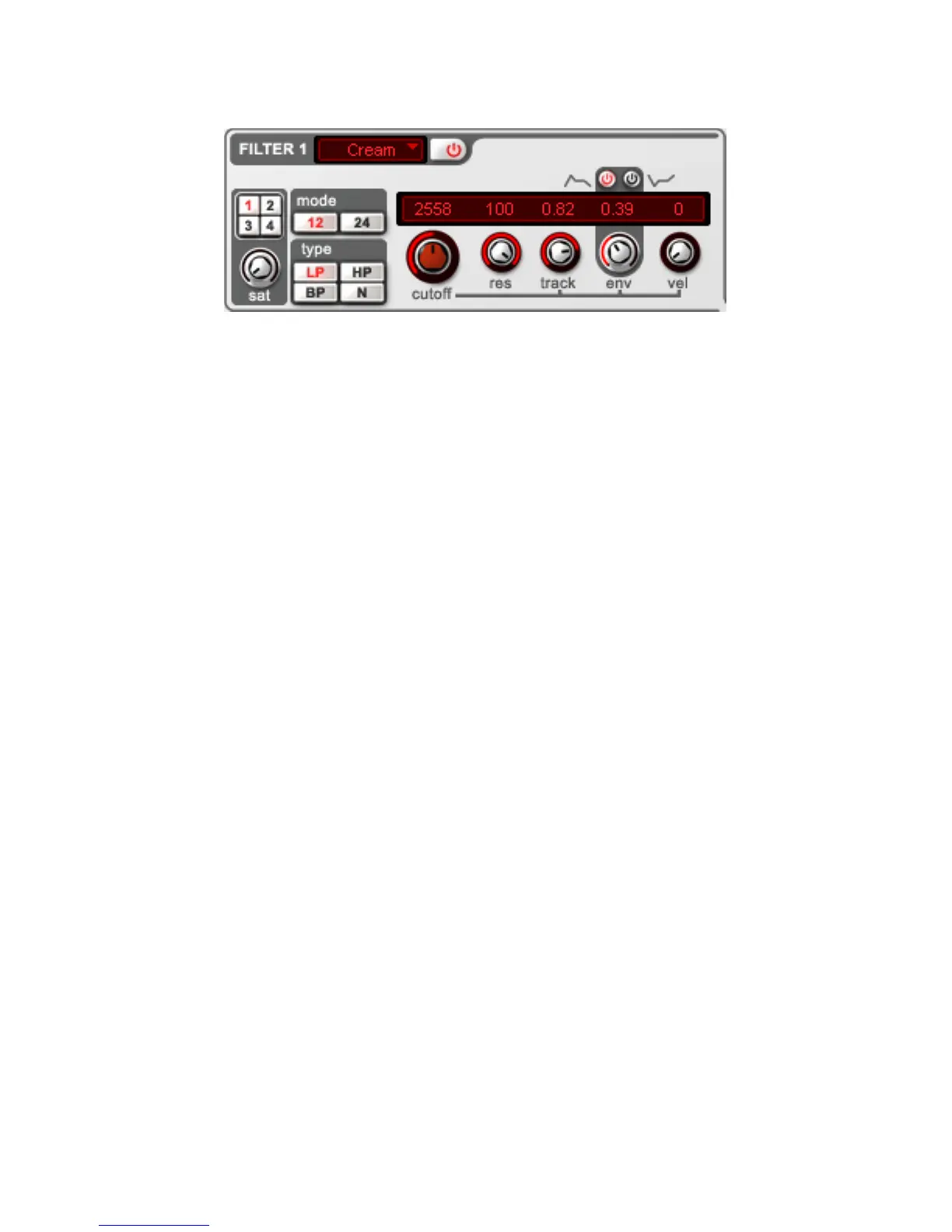 Filter Typen kann auf 12dB oder 24dB Modus umgeschaltet werden.