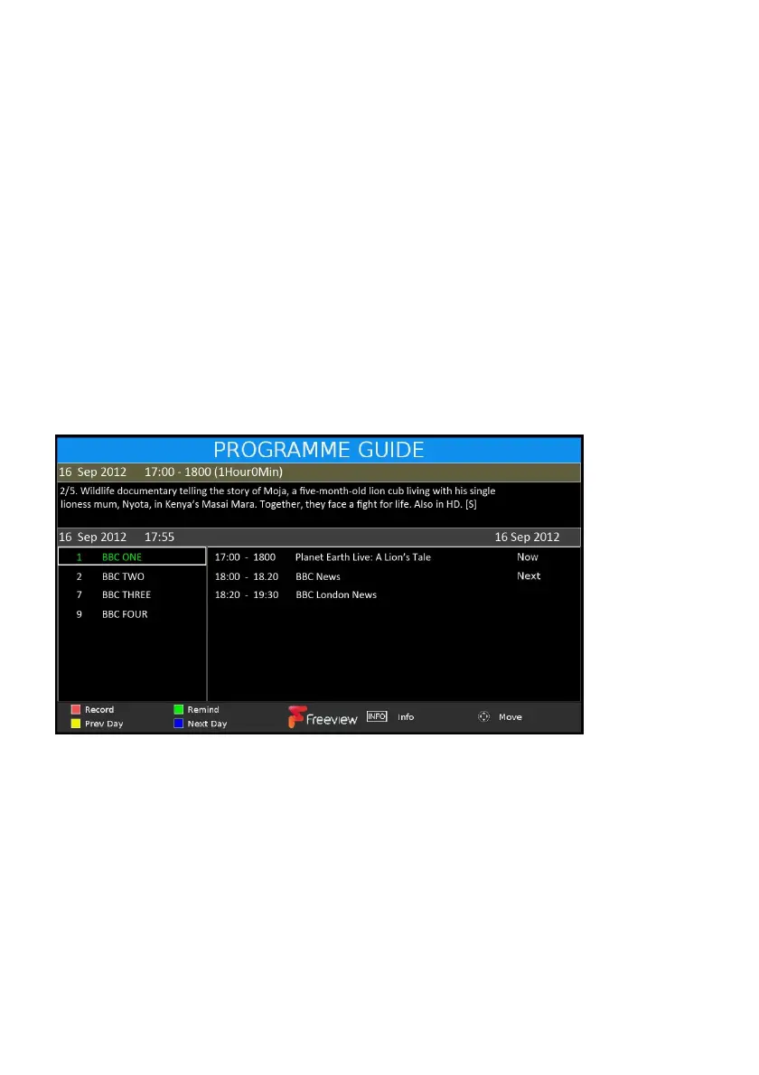 - Press BLUE button to display program guide of next day.